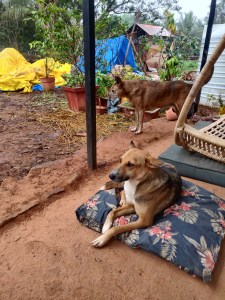 Dog-Two was an ultra-friendly, calm, giant dog, twice Cheeru’s size. Cheeru does not like “ultra-friendly” which is now well established and given my recent life experiences, I may tend to concur. Ultra friendly and giant dog…erm…I get her discomfort. So I just tried to avoid situations where they may have to meet. But things don’t always go as planned. One of the times he approached the cab, Cheeru was outside the cabin, sniffing. I called out to her and pointed at Dog-Two and then opened the cabin door if she wanted to run in. She did not. She froze, hackles up, tail up and she stiffened. What was lovely to watch was how Dog-Two stopped in his tracks. He got the message, loud and clear. He stopped and turned his face. Cheeru eased up. They started walking around in large circles, sniffing, peeing, sniffing the pee….looked like a ballroom dance ritual. He approached her twice. She froze, hackles up and let out a low growl. He froze, turned his head and backed off. And they disengaged, just like that. She came running back in and he left her alone. Phew! That was tense…but it was so good to watch that both dogs knew how to resolve that without actually fighting.