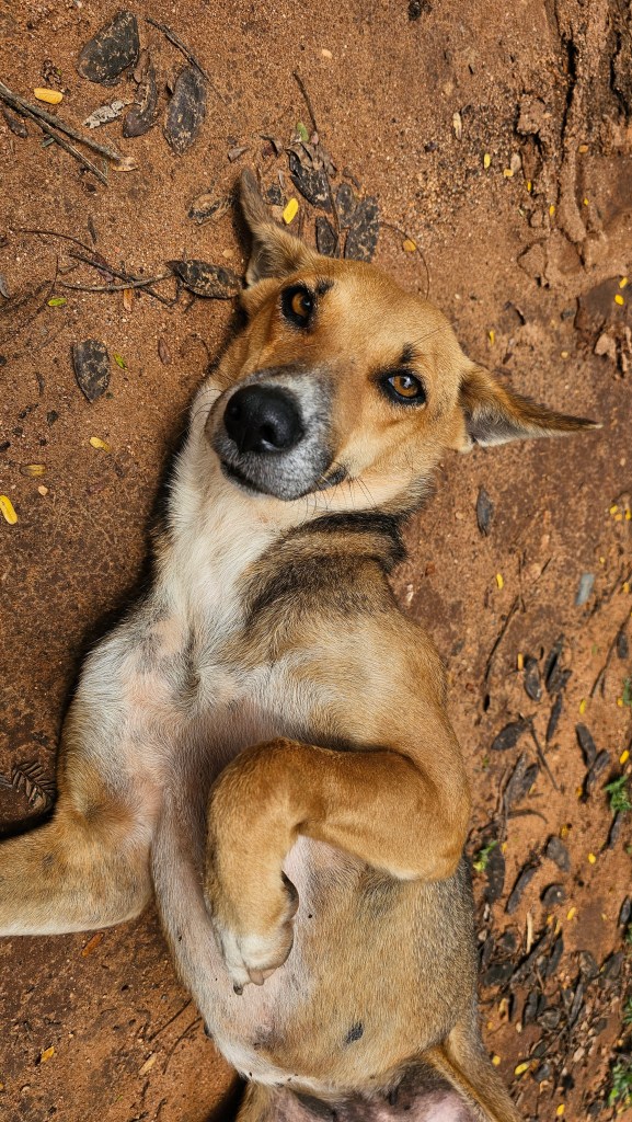 Dans cette famille, Chaita pourrait être l’aînées de la communauté. Le groupe suit son exemple. C’est elle qui a décidé d’emménager dans la propriété en face de la mienne, lorsque je suis arrivée ici, il y a trois ans. Sa famille a suivi peu à peu. Une fois qu’elle a déménagé, elle a décidé d’être gentille avec ma chienne Cheeru (qui n’est malheureusement plus des nôtres), qui n’aimait pas particulièrement Chaita. Chaita avait une façon très particulière d’apaiser Cheeru et ses filles l’ont rapidement compris. Si Chaita était gentille avec Cheeru, elle ne l’est pas toujours avec tous les chiens. Elle est souvent à l’origine de conflits avec d’autres chiens et sa famille se joint rapidement à elle. C’est Chaita qui a été la première à se lier d’amitié avec Elvis. Rapidement, j’ai remarqué que le reste de la famille jouait avec lui. Soudain, Chaita a changé d’avis sur Elvis et, quelques jours plus tard, tout le groupe a changé d’attitude à l’égard d’Elvis.