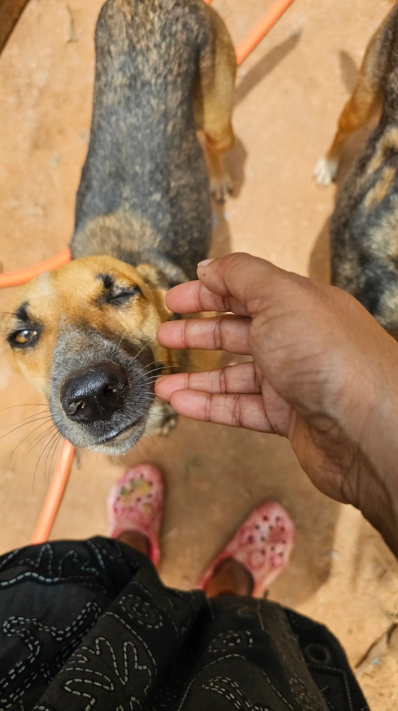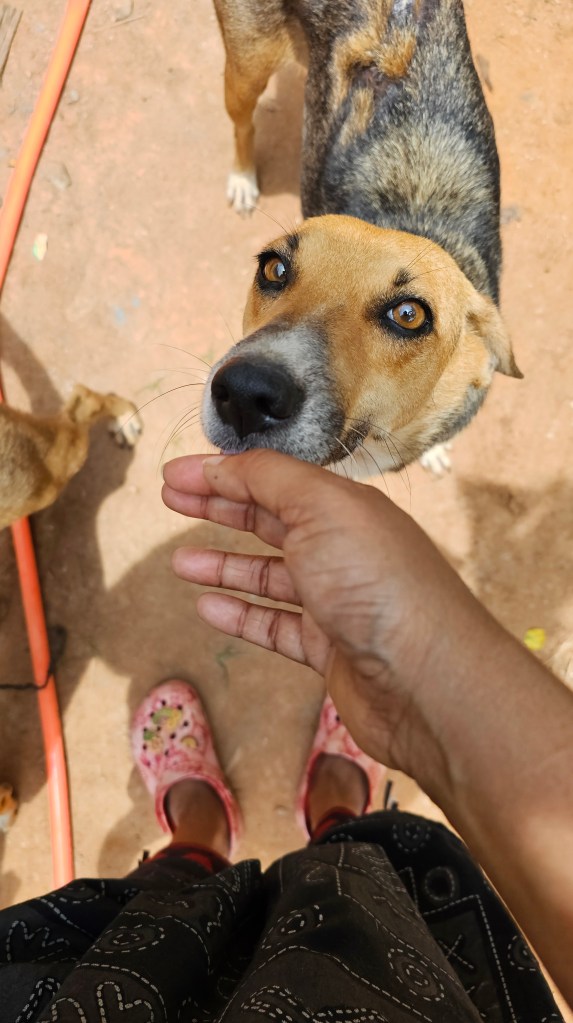 Oviya also banters that “she likes “Yaya Chaita”, better than “Yaya Dude”. I suspect Dude may not be her favourite of this lot. I can understand why. While he’s shy, he wrecks havock on the farm. He jumps into our lily pond, kills the lily plants, jumps out and rolls in the mud, rips apart anything remotely edible left on sight, including the all-purpose-flour that we were using to make gum. But he’s a hoot. I mean look at him! His ears don’t match and he looks like someone slapped him with muddy fingers on both cheeks. But there’s more to this dog. Sure, he’s shy and does not risk humans touch. But he gains strength from his family to cope his fear often. As his sisters fuss around humans, he shows up, keeps a close eye on them, using their reactions to alert himself, musters the courage to approach and attempts to touch us or invites us to touch him briefly and respectfully.